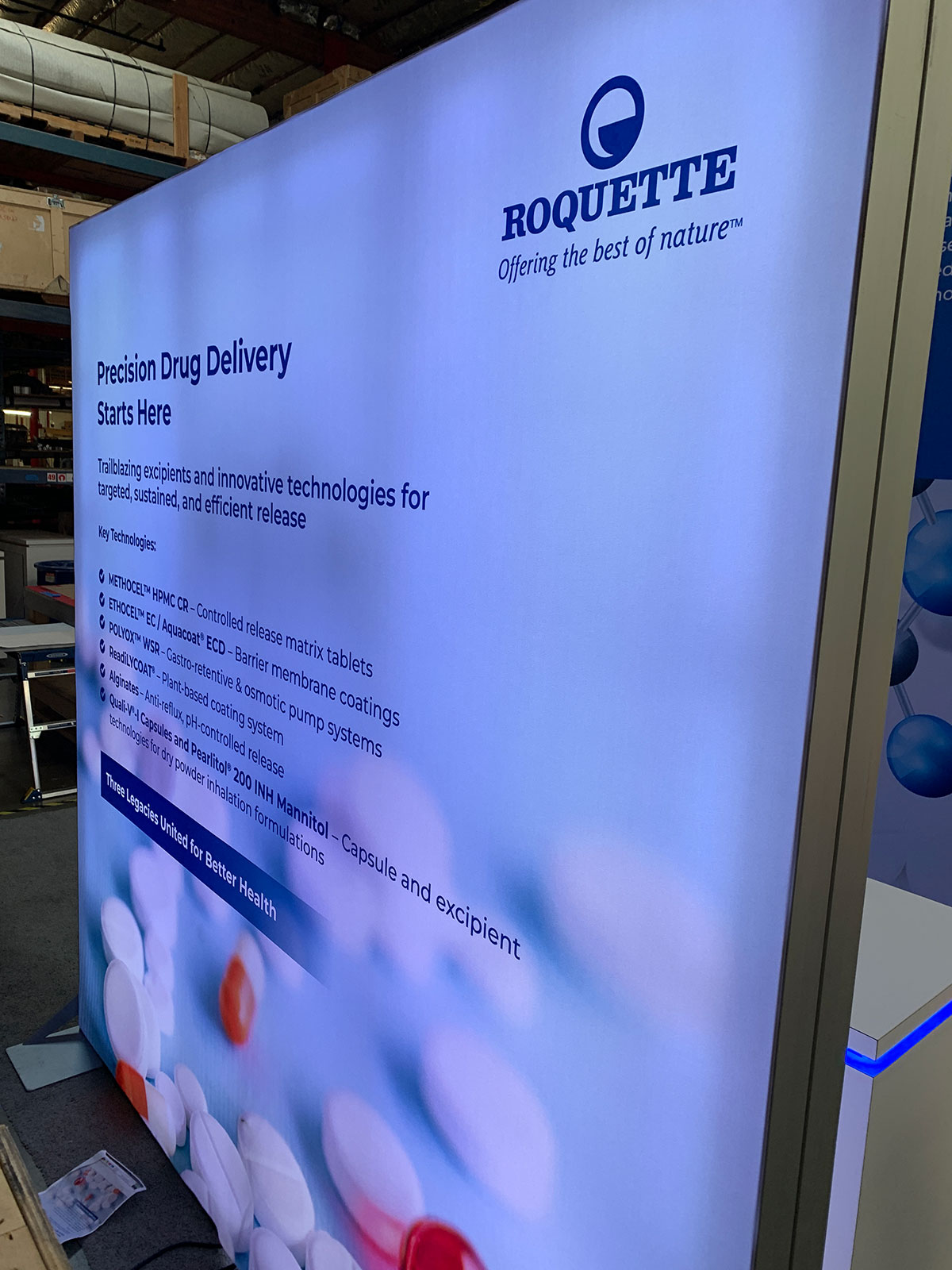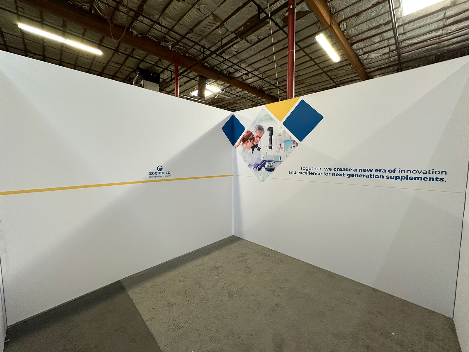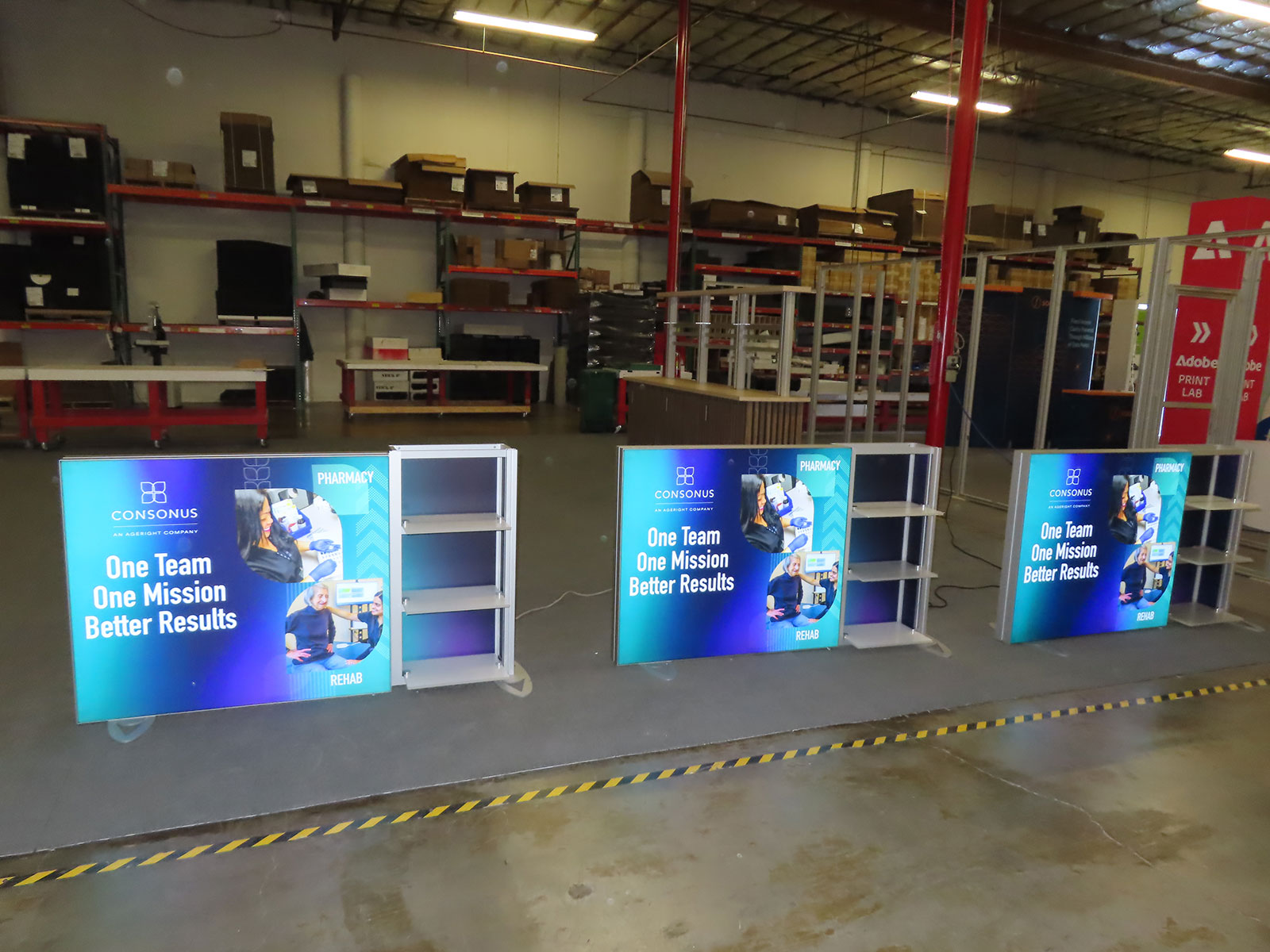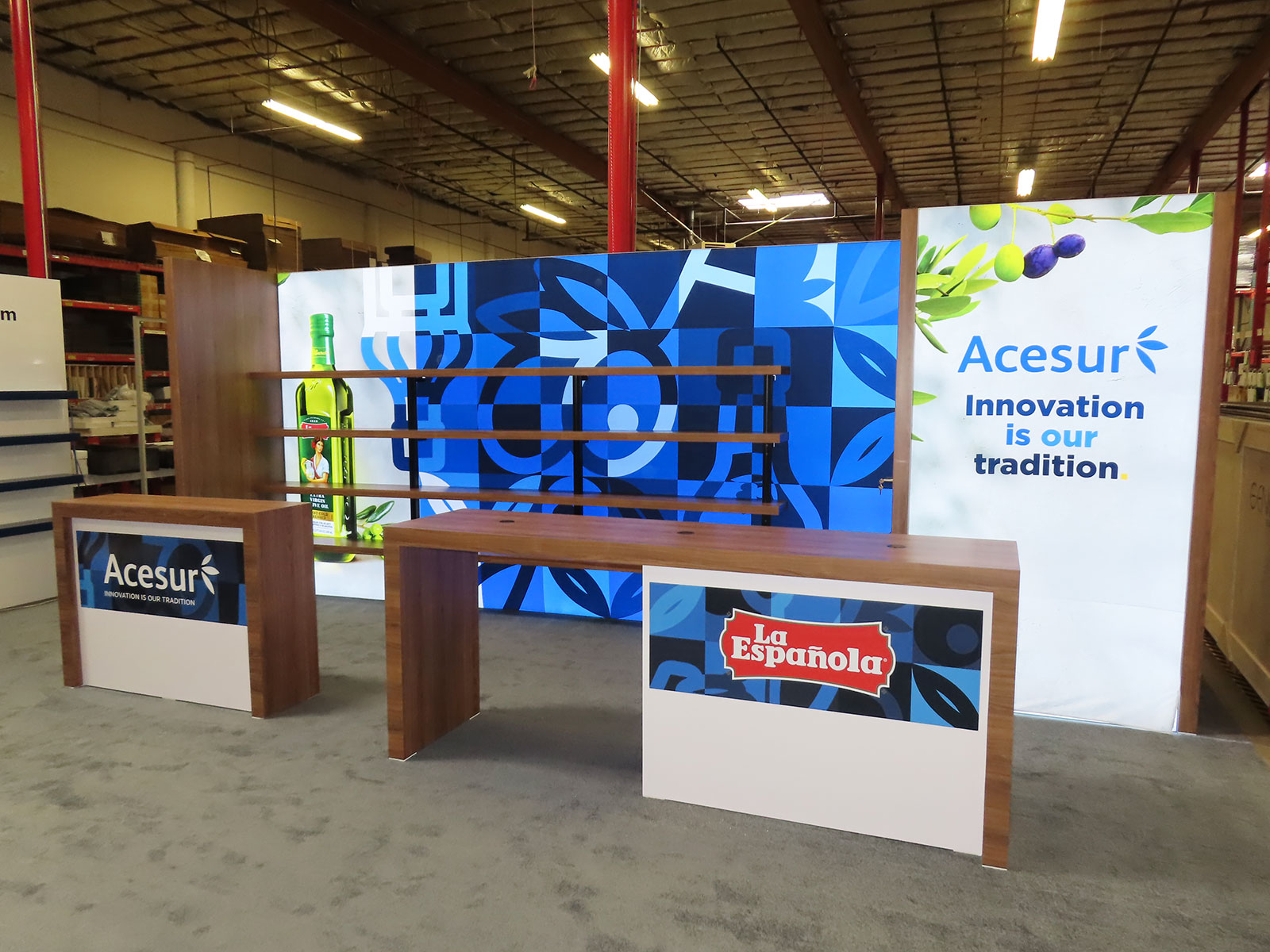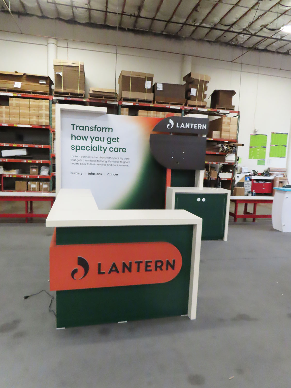 Custom Inline Exhibit with SuperNova Backlit Lightboxes, (4) Product Shelves, Storage Closet, Fabric and Direct Print Graphics, Reception Counter w/ Open Storage, and Counter w/ Locking Storage and Wireless Charging Pads [ORD-69079]