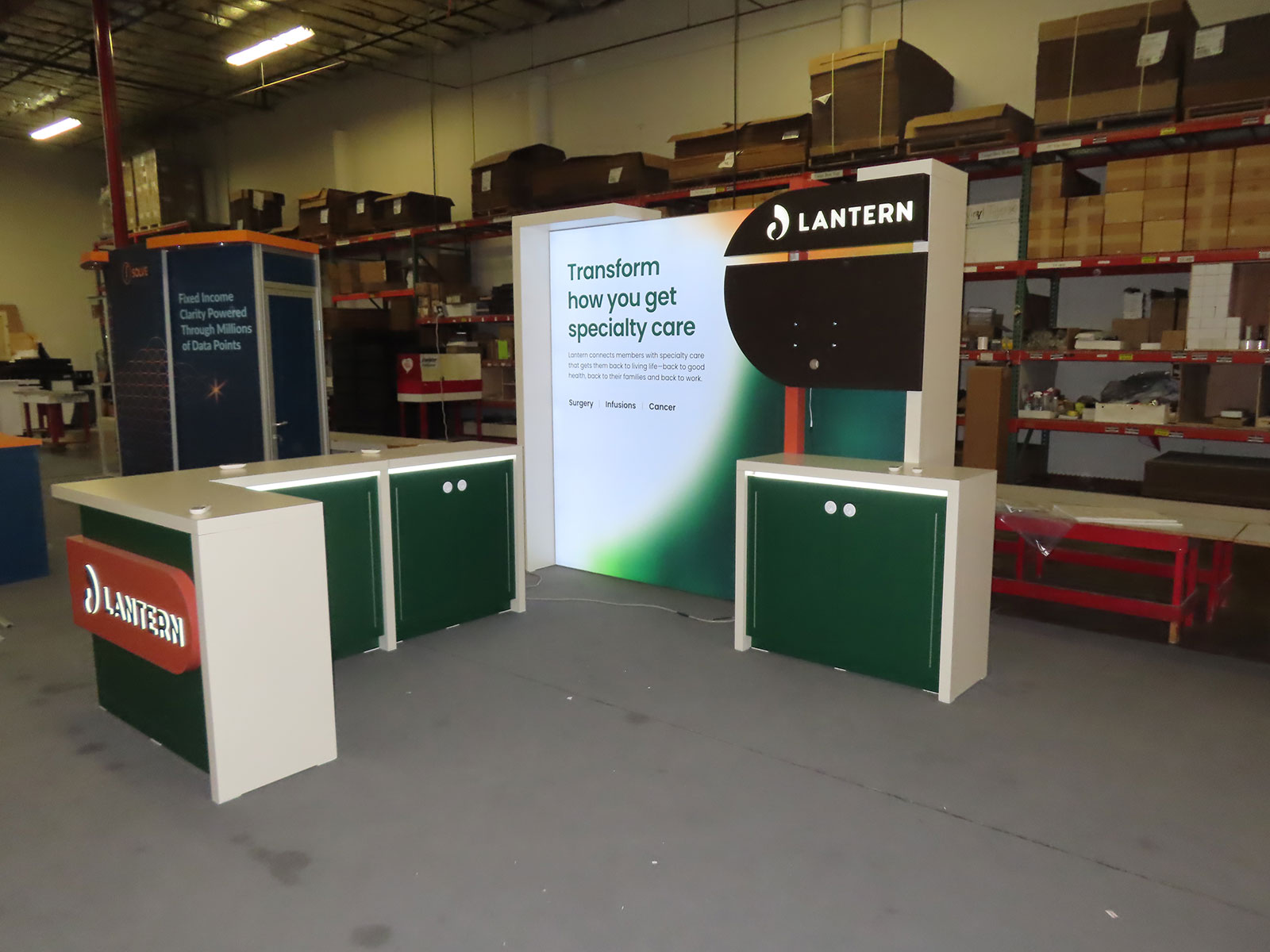 Modified ECO-2064 Sustainable Exhibit with Tension Fabric and Direct Print Graphics, Header, Acrylic Shlelves, Locking Storage, LED Lighting, Privacy Wall, Monitor Mount, and MOD-1716 Backlit Reception Counter with Locking Storage [ORD-67046]