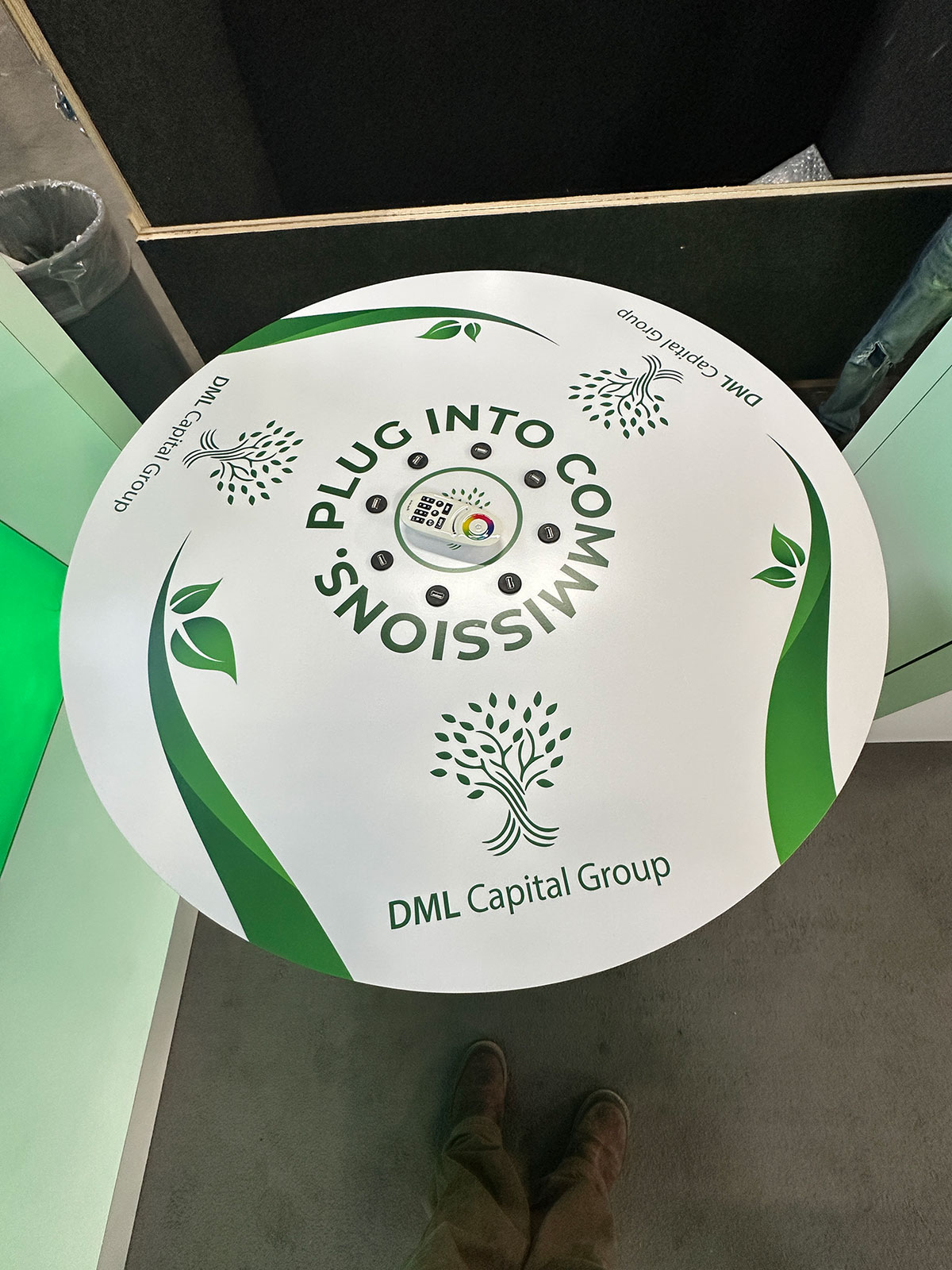 SYK-2006 Symphony Portable Modular Display with SEG Fabric Graphics, Backwall Workstation with Wireless Charging Pads, and LED Stem Lights [ORD-69134]
