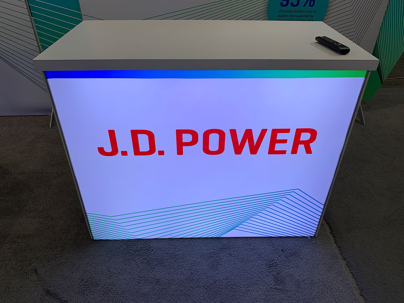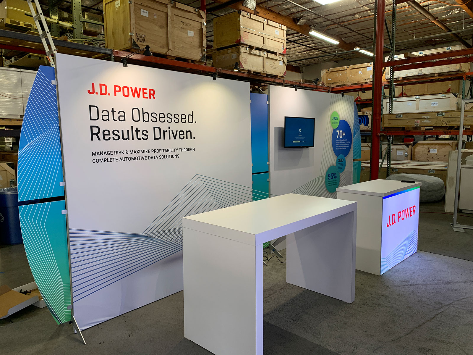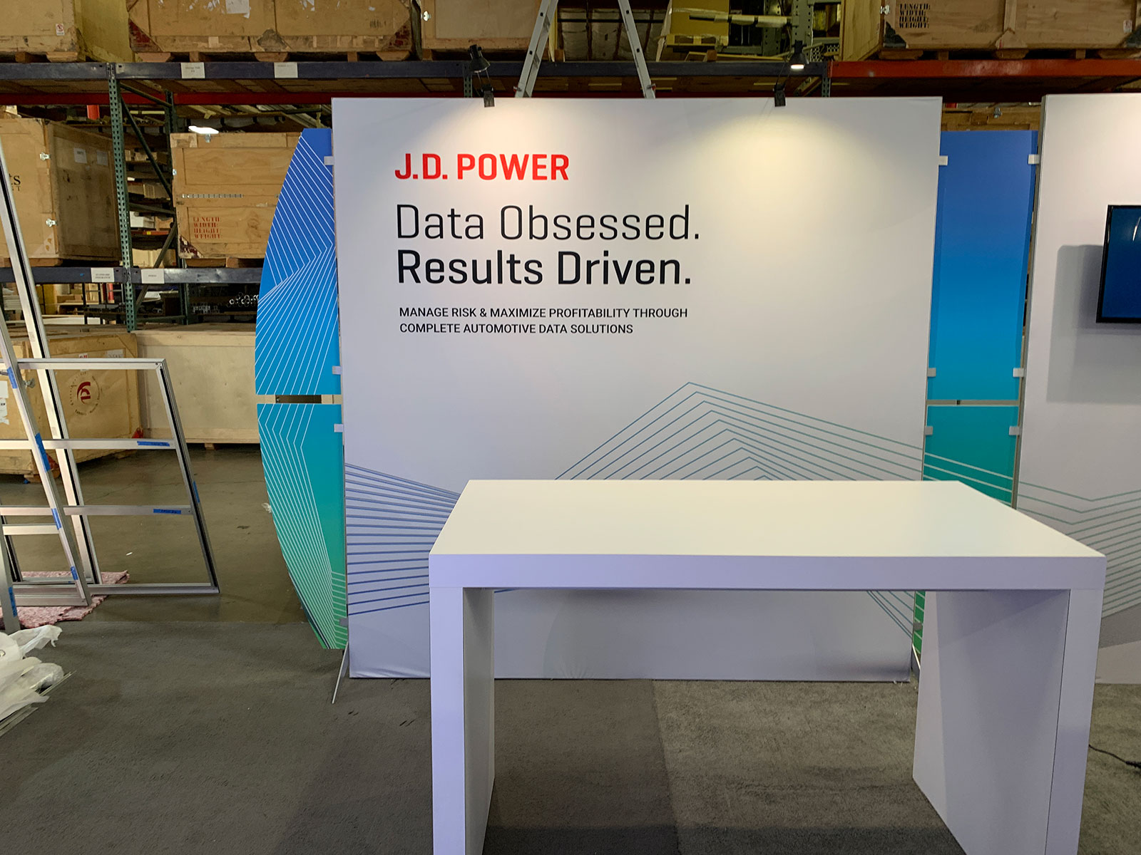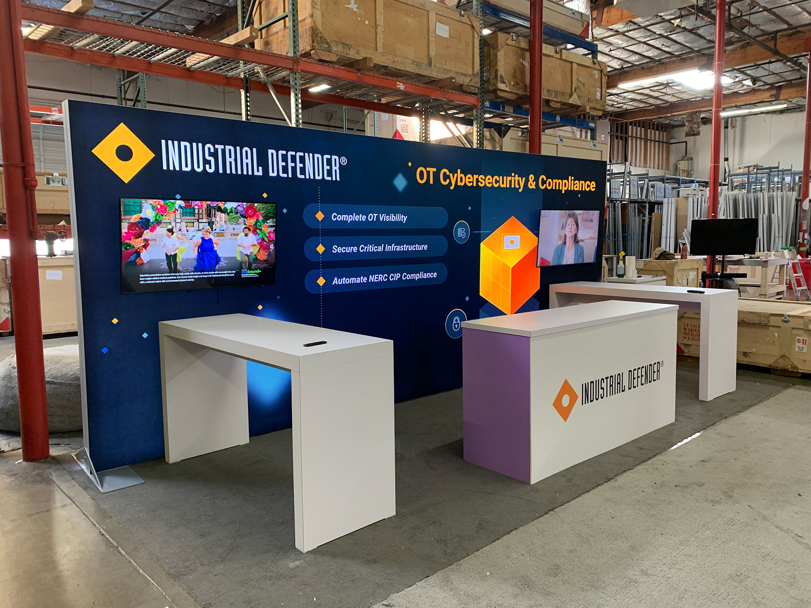 RENTAL: Modified RE-1081 Design with White Laminated Backwall with Recessed Single-Sided Lightbox, RE-1575 Reception Counter, Workstation Pedestal, RE-704 Charging Station Table, Large Monitor Mount, 43" Monitor, SEG Backlit Fabric Graphic, Vinyl Applied RENTAL: Modified RE-1081 Exhibit -- View 2 RENTAL: Modified RE-1081 Exhibit -- View 3 RENTAL: Modified RE-1081 Exhibit -- View 4 RENTAL: Modified RE-1081 Exhibit -- View 5