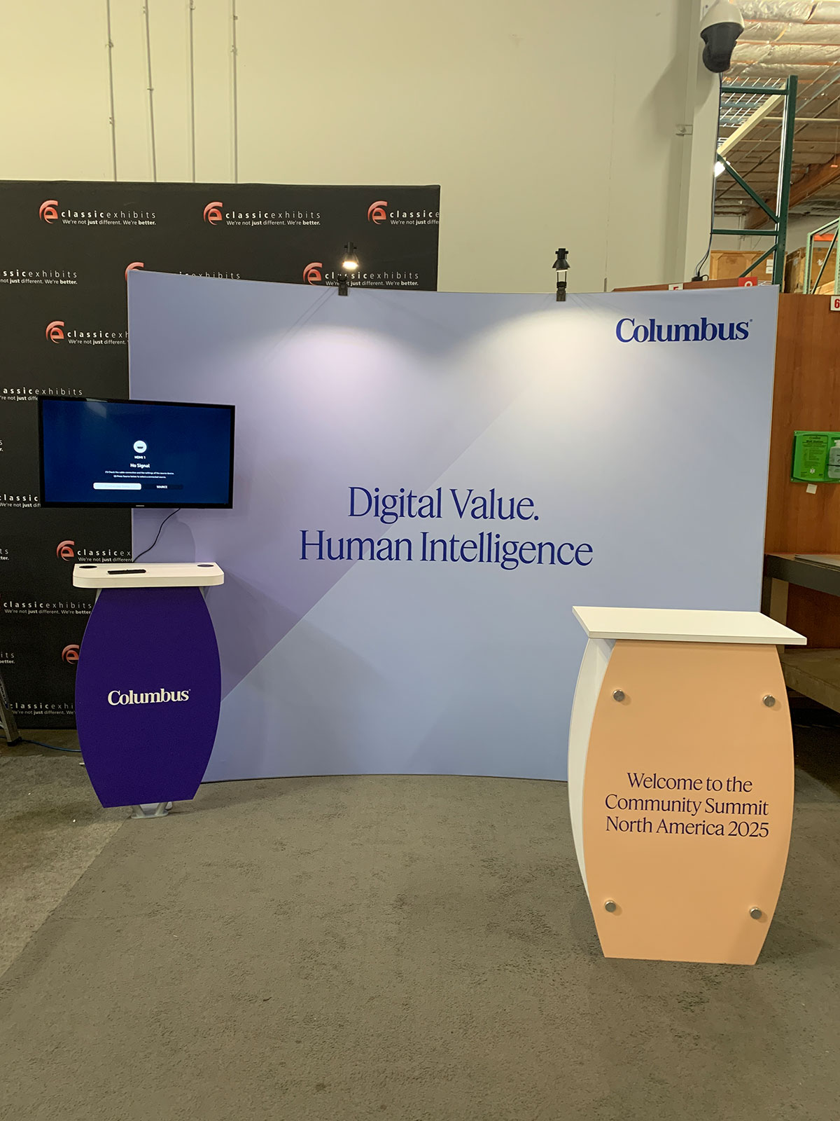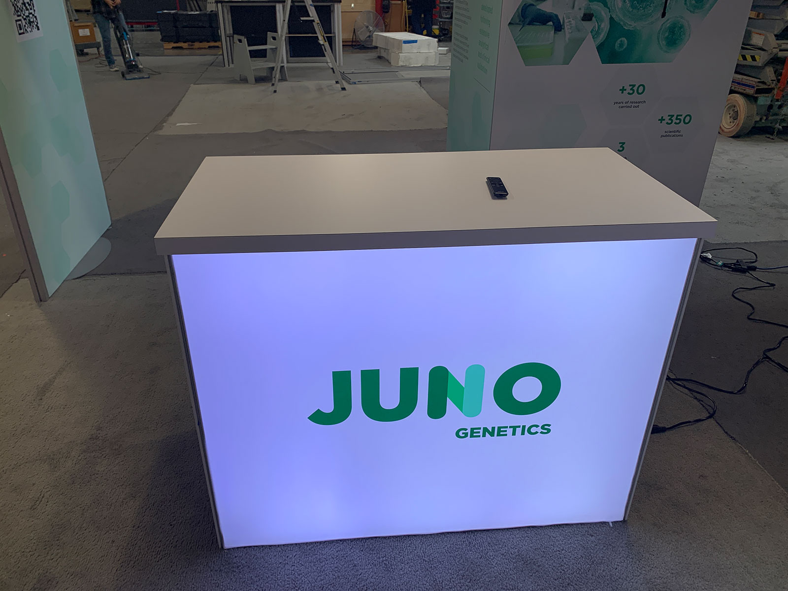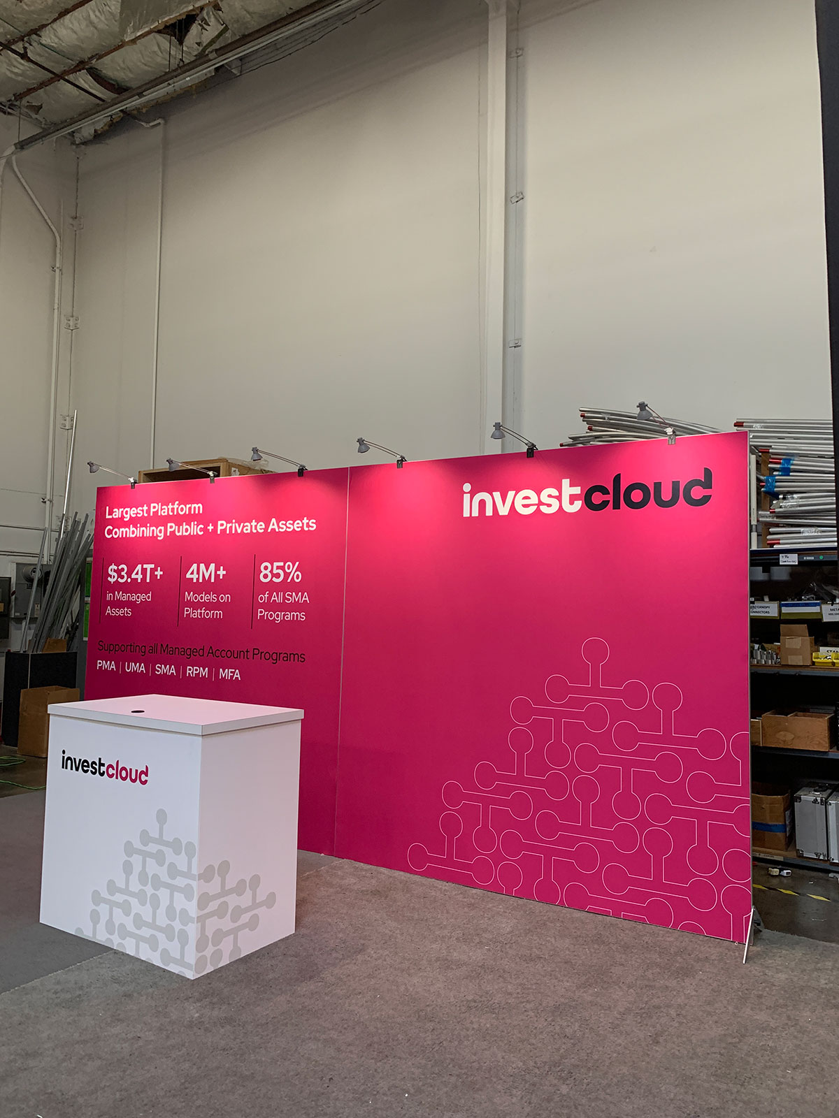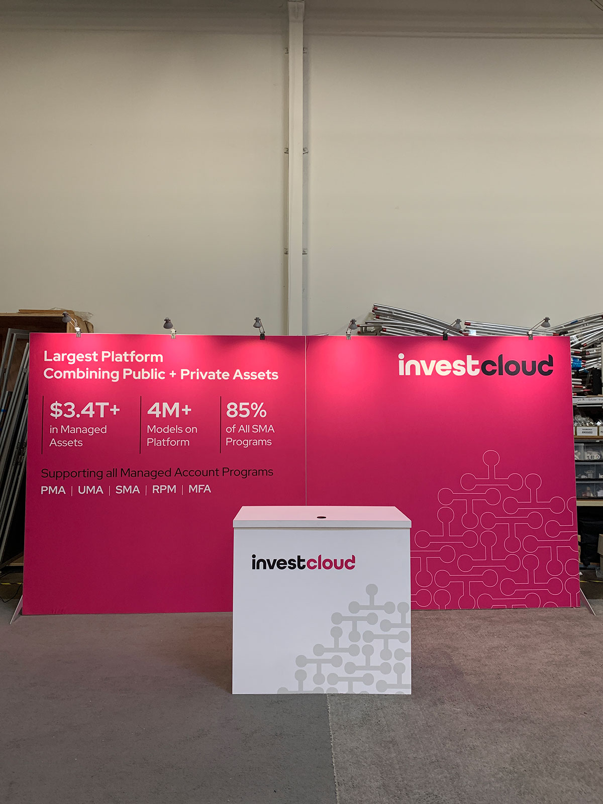 RENTAL: Modified RE-1081 Design with White Laminated Backwall with Recessed Single-Sided Lightbox, RE-1575 Reception Counter, Workstation Pedestal, RE-704 Charging Station Table, Large Monitor Mount, 43" Monitor, SEG Backlit Fabric Graphic, Vinyl Applied RENTAL: Modified RE-1081 Exhibit -- View 2 RENTAL: Modified RE-1081 Exhibit -- View 3 RENTAL: Modified RE-1081 Exhibit -- View 4 RENTAL: Modified RE-1081 Exhibit -- View 5