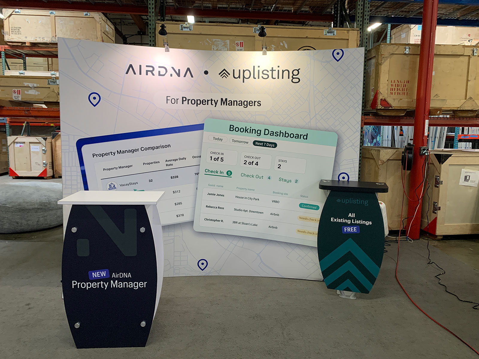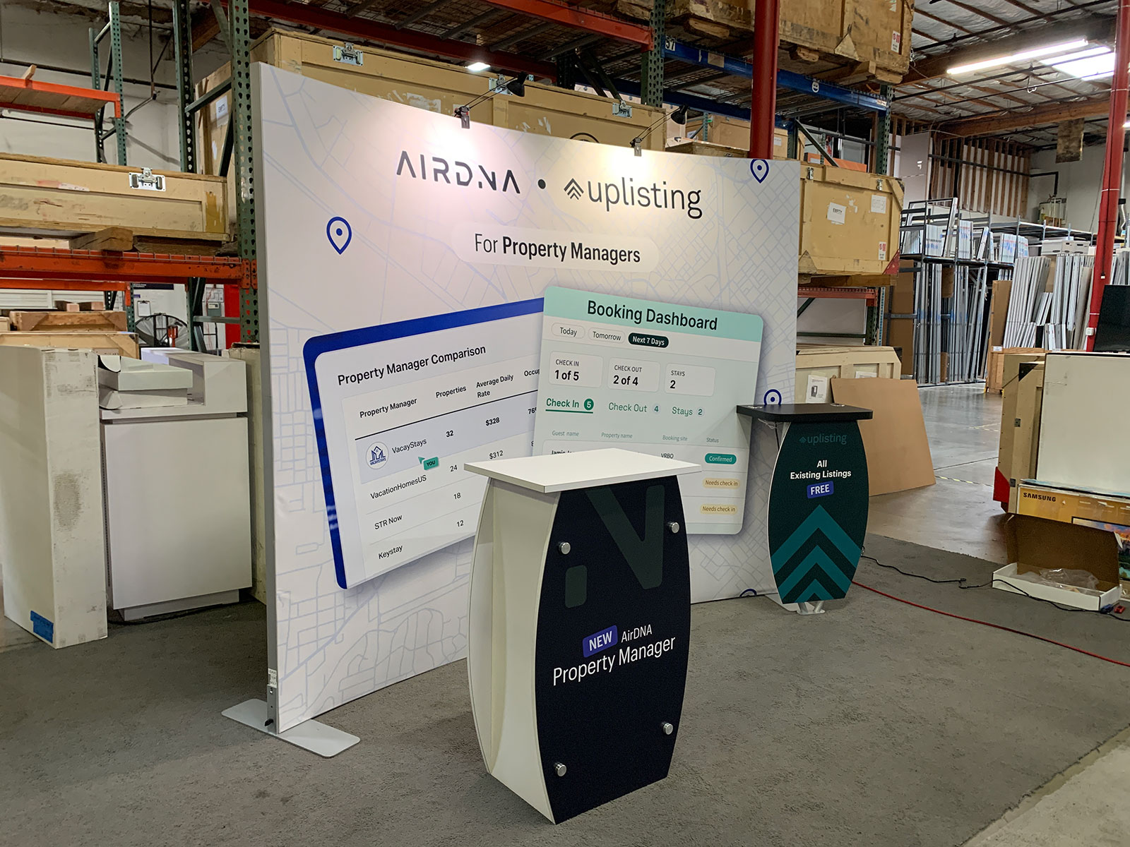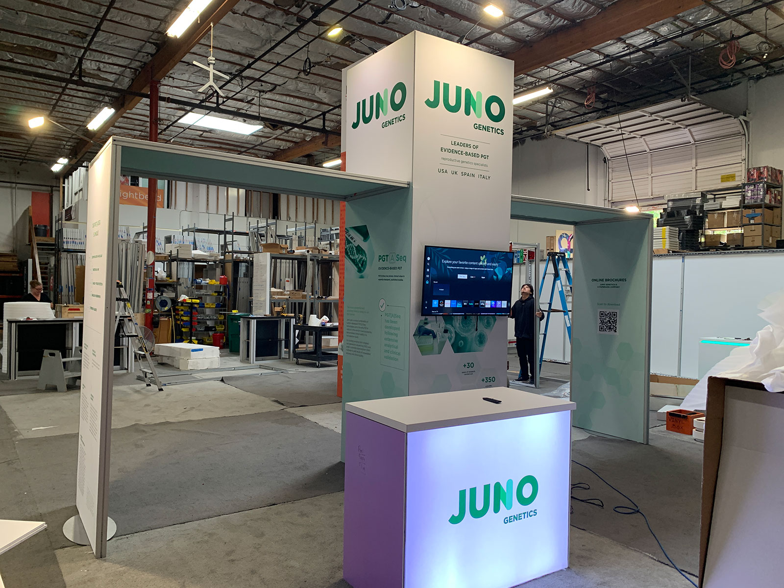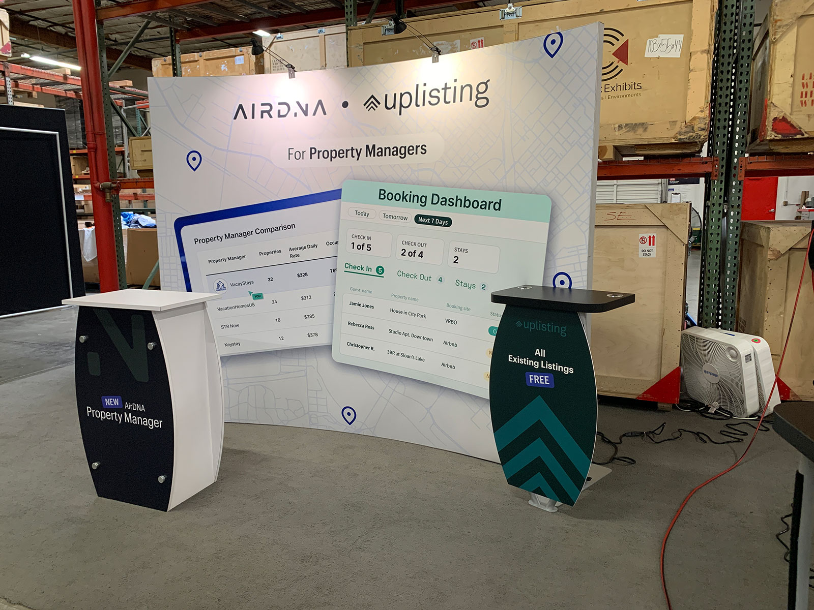 RENTAL: Modified RE-1081 Design with White Laminated Backwall with Recessed Single-Sided Lightbox, RE-1575 Reception Counter, Workstation Pedestal, RE-704 Charging Station Table, Large Monitor Mount, 43" Monitor, SEG Backlit Fabric Graphic, Vinyl Applied RENTAL: Modified RE-1081 Exhibit -- View 2 RENTAL: Modified RE-1081 Exhibit -- View 3 RENTAL: Modified RE-1081 Exhibit -- View 4 RENTAL: Modified RE-1081 Exhibit -- View 5