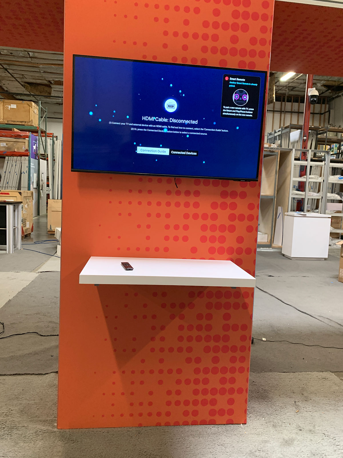 RENTAL: Modified RE-1081 Design with White Laminated Backwall with Recessed Single-Sided Lightbox, RE-1575 Reception Counter, Workstation Pedestal, RE-704 Charging Station Table, Large Monitor Mount, 43" Monitor, SEG Backlit Fabric Graphic, Vinyl Applied Counter and Charging Station Table Graphics [ORD-69099]