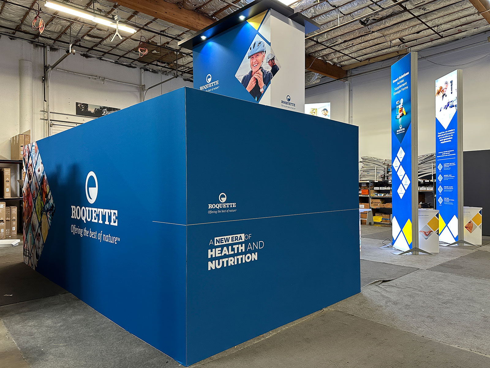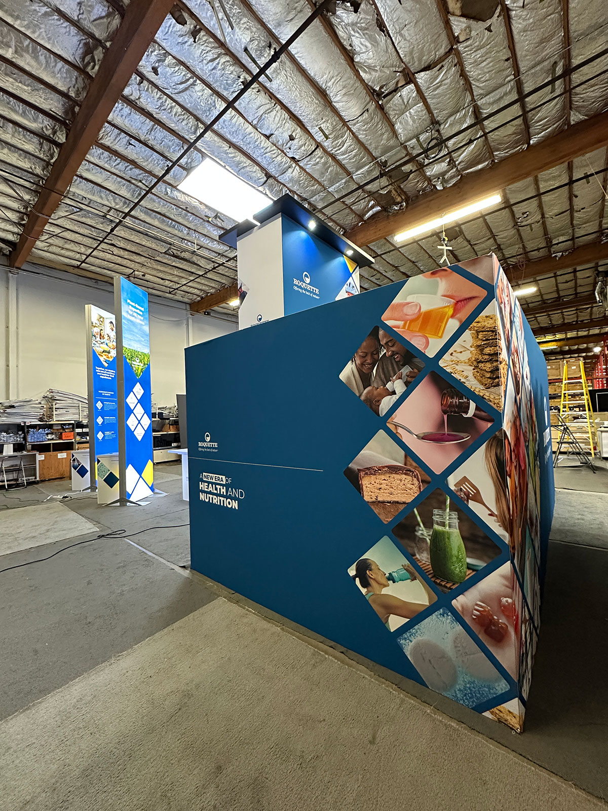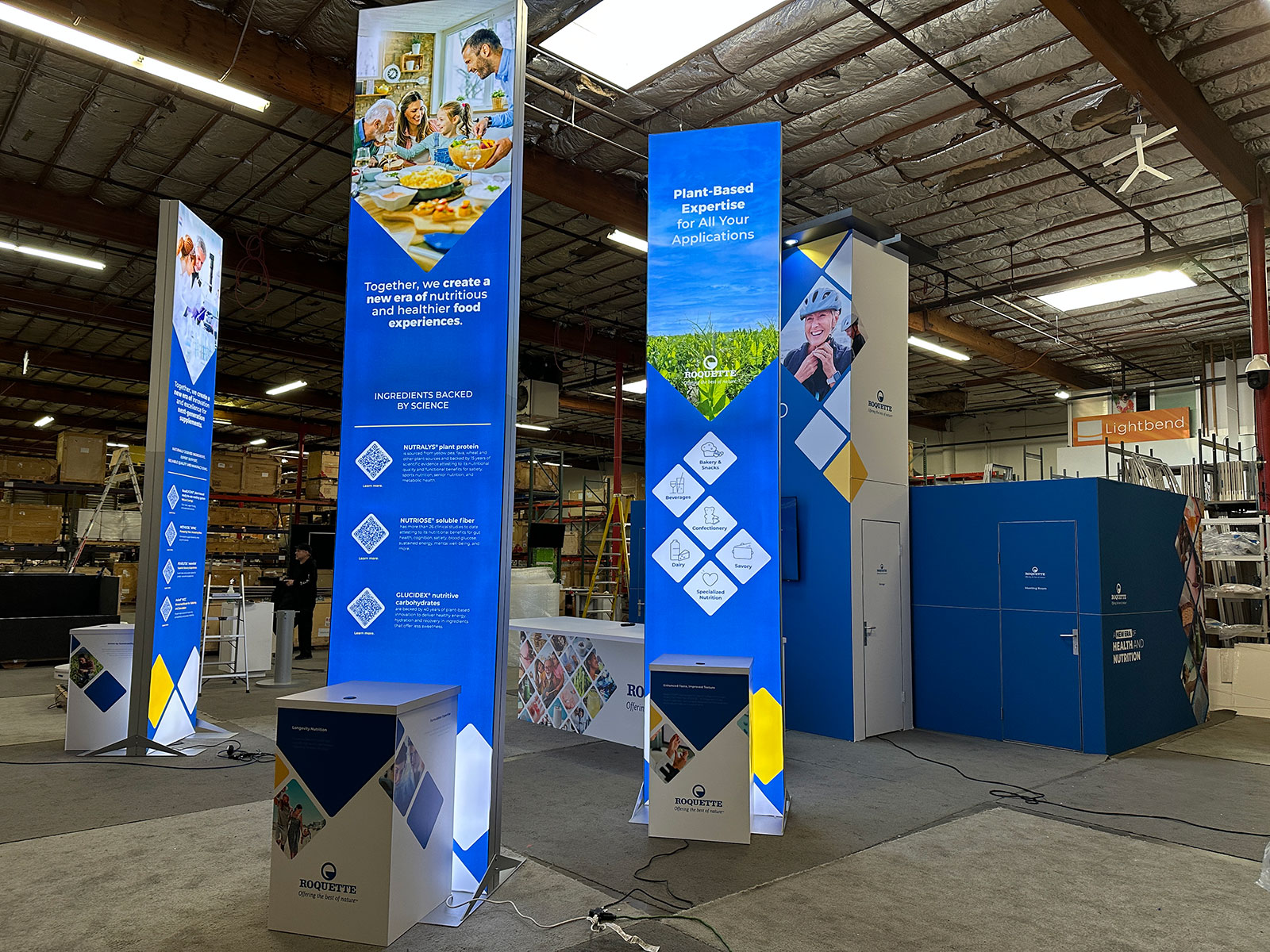 Custom Inline Exhibit with SuperNova Backlit Lightboxes, (4) Product Shelves, Storage Closet, Fabric and Direct Print Graphics, Reception Counter w/ Open Storage, and Counter w/ Locking Storage and Wireless Charging Pads Custom Inline Exhibit with SuperNova Backlit Lightboxes -- View 2 Custom Inline Exhibit with SuperNova Backlit Lightboxes -- View 3 Custom Inline Exhibit with SuperNova Backlit Lightboxes -- View 4 Custom Inline Exhibit with SuperNova Backlit Lightboxes -- View 5 Custom Inline Exhibit with SuperNova Backlit Lightboxes -- View 6
