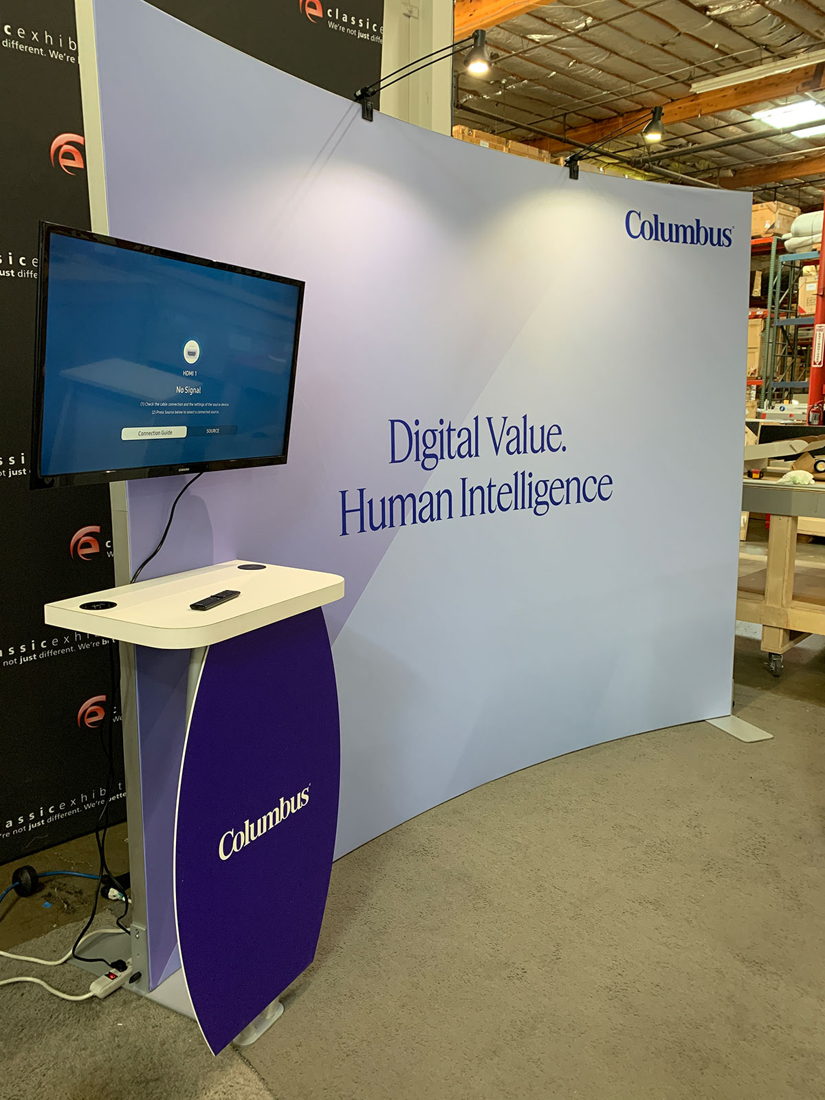 RENTAL: RE-1073 Symphony Inline Design with Large Concave Curved Frame, RE-1255 Backwall Workstation Counter with Two Wireless Charging Ports, (2) LED Arm Lights, SEG Fabric Graphics, and Vinyl Applied Graphic [ORD-68934]